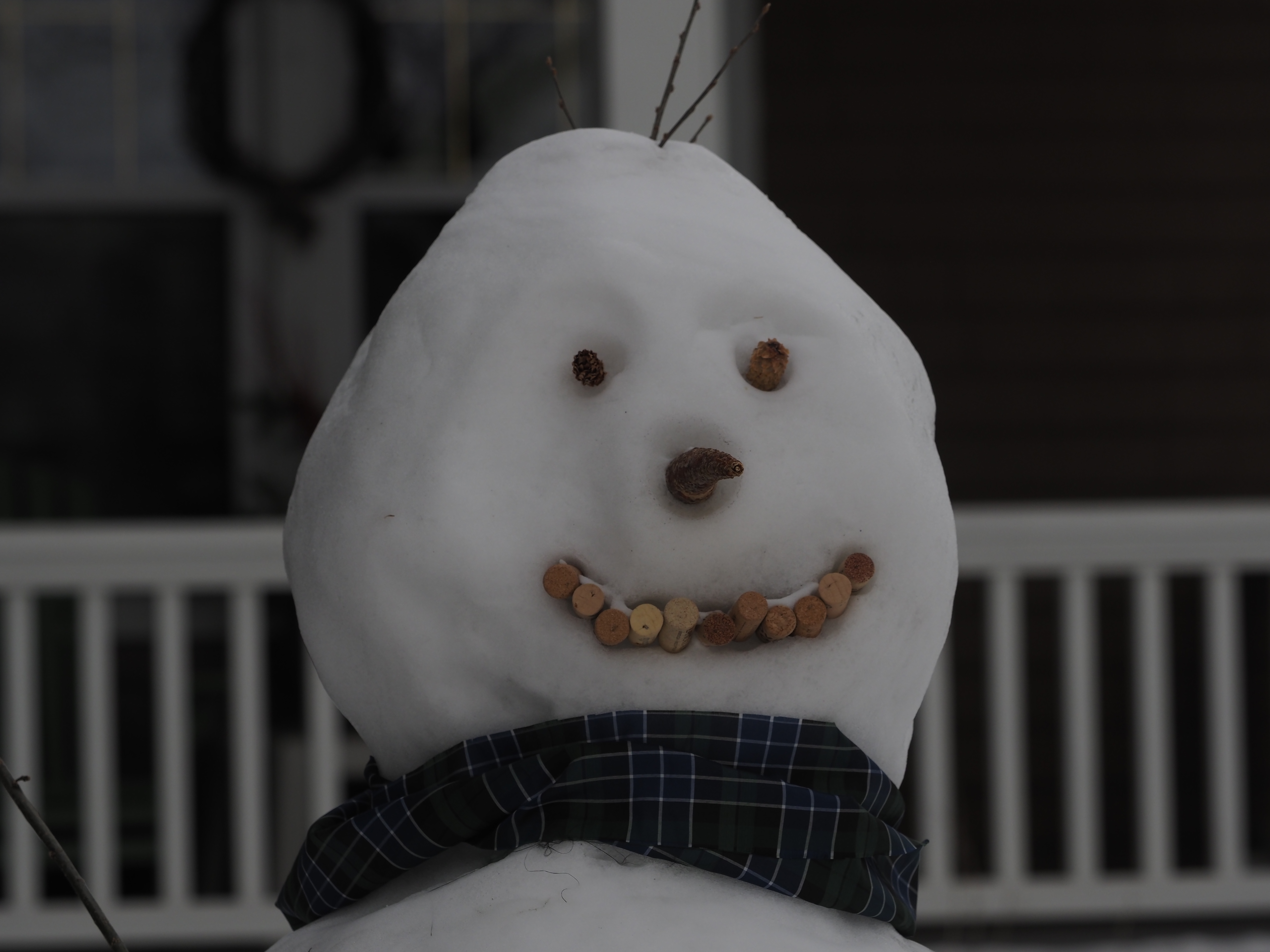 - a snowman with a mouth made of wine corks and pinecone eyes