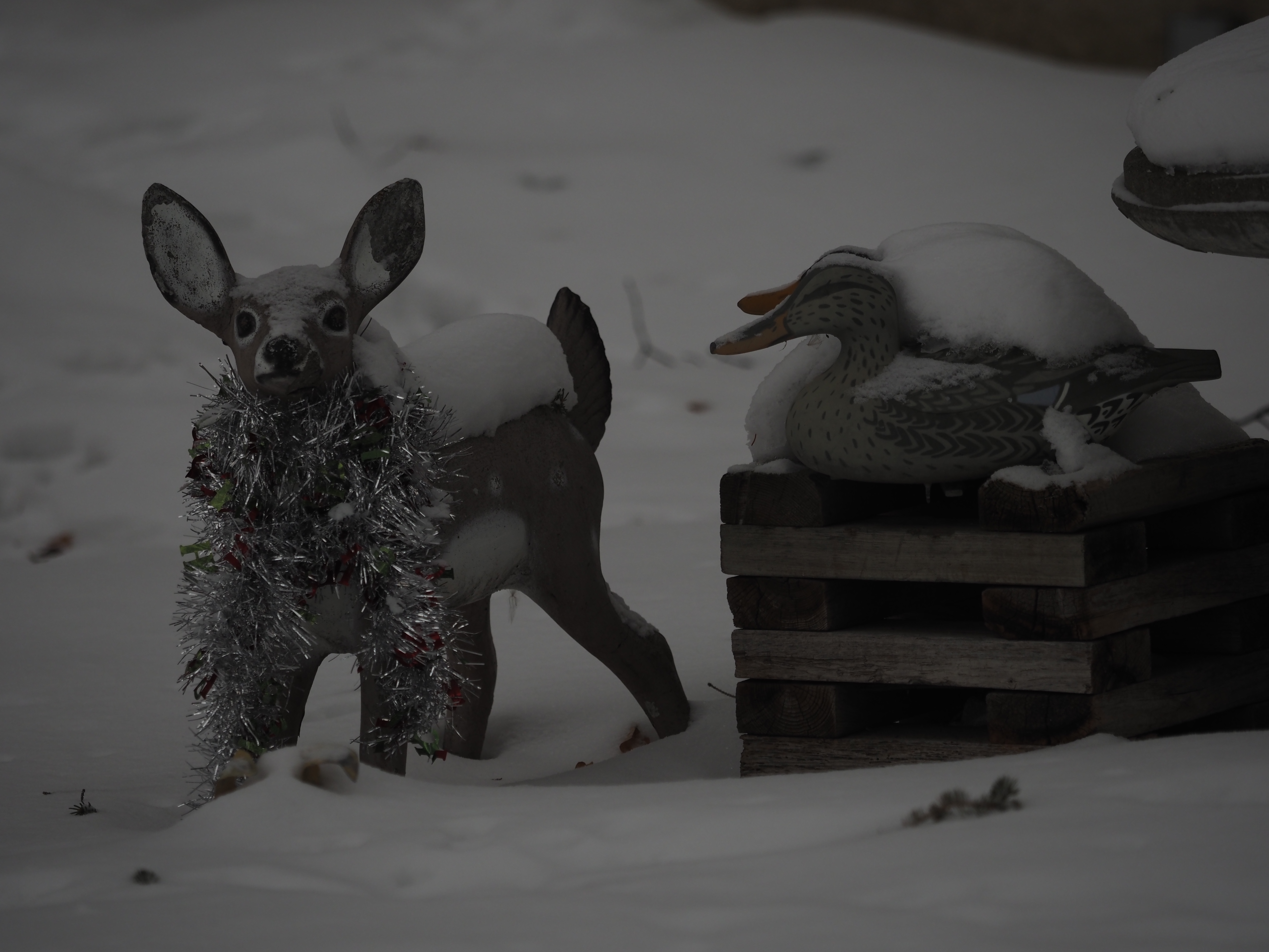 a plastic doe with tinsil around it next to 2 wooden ducks covered in snow