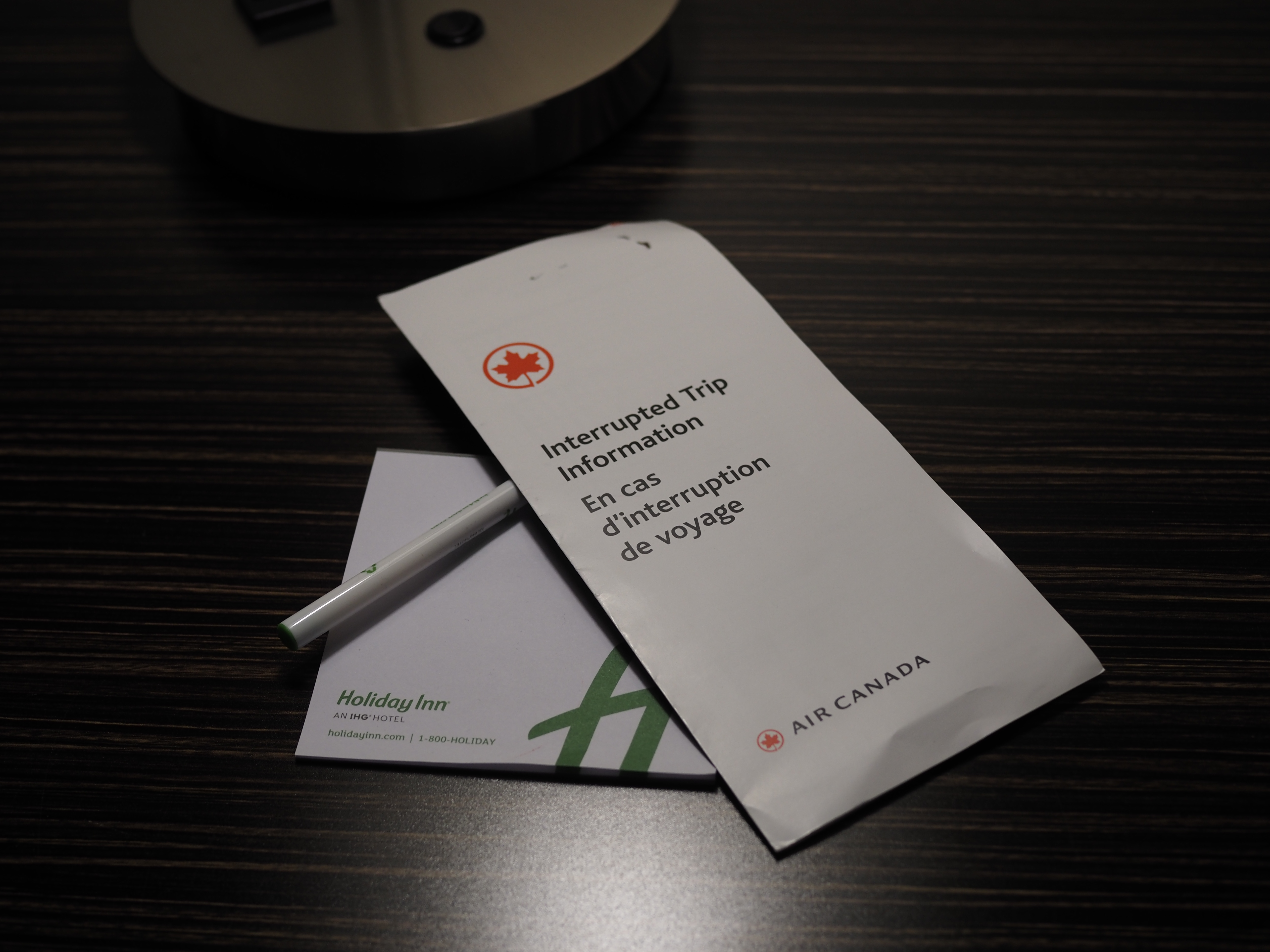 a holiday in notepad and a brochure on a wooden desk. the brochure reads "Interrupted Trip Information" in English and French