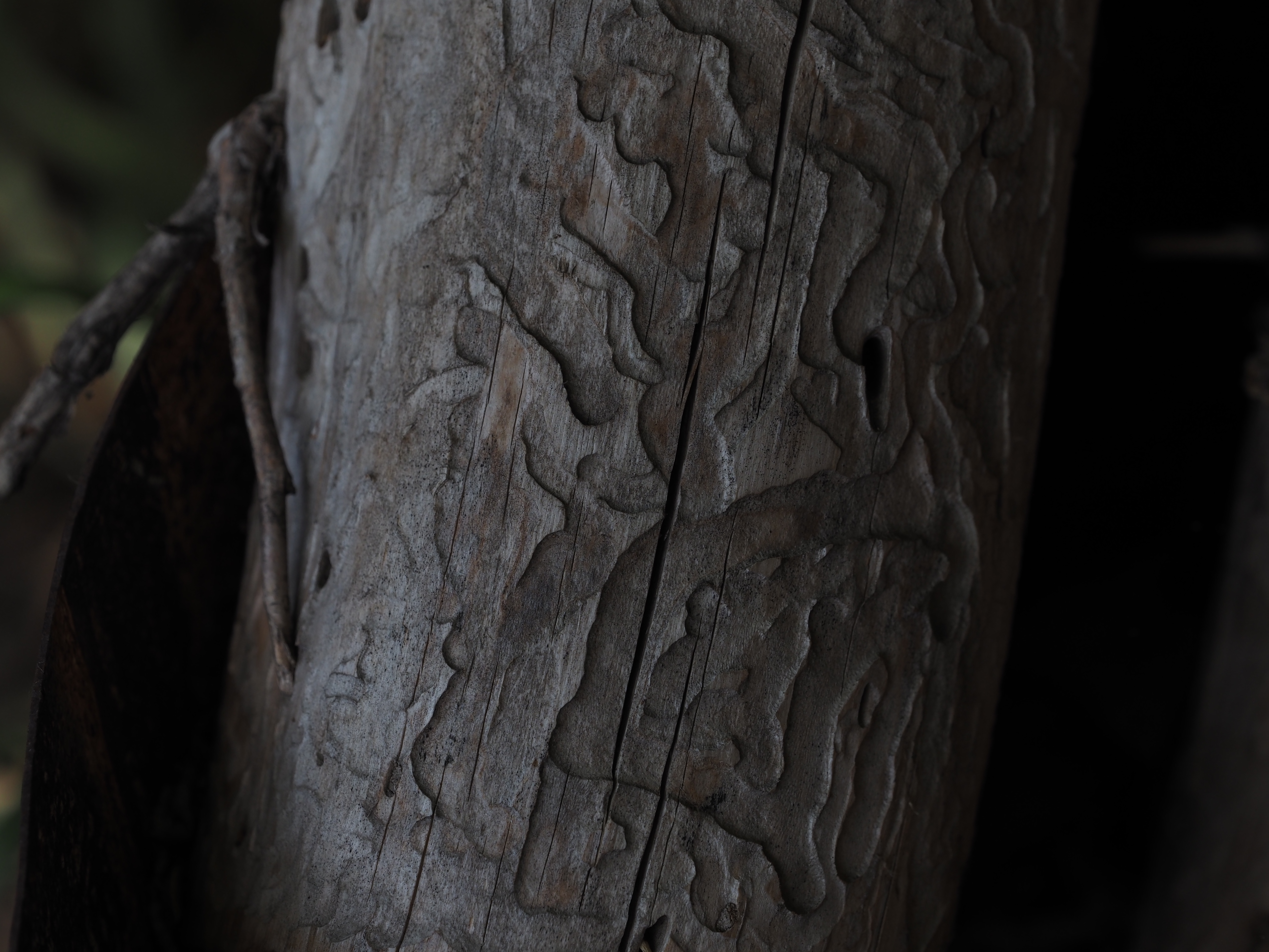 - irregular grooves etched into a piece of wood by insects