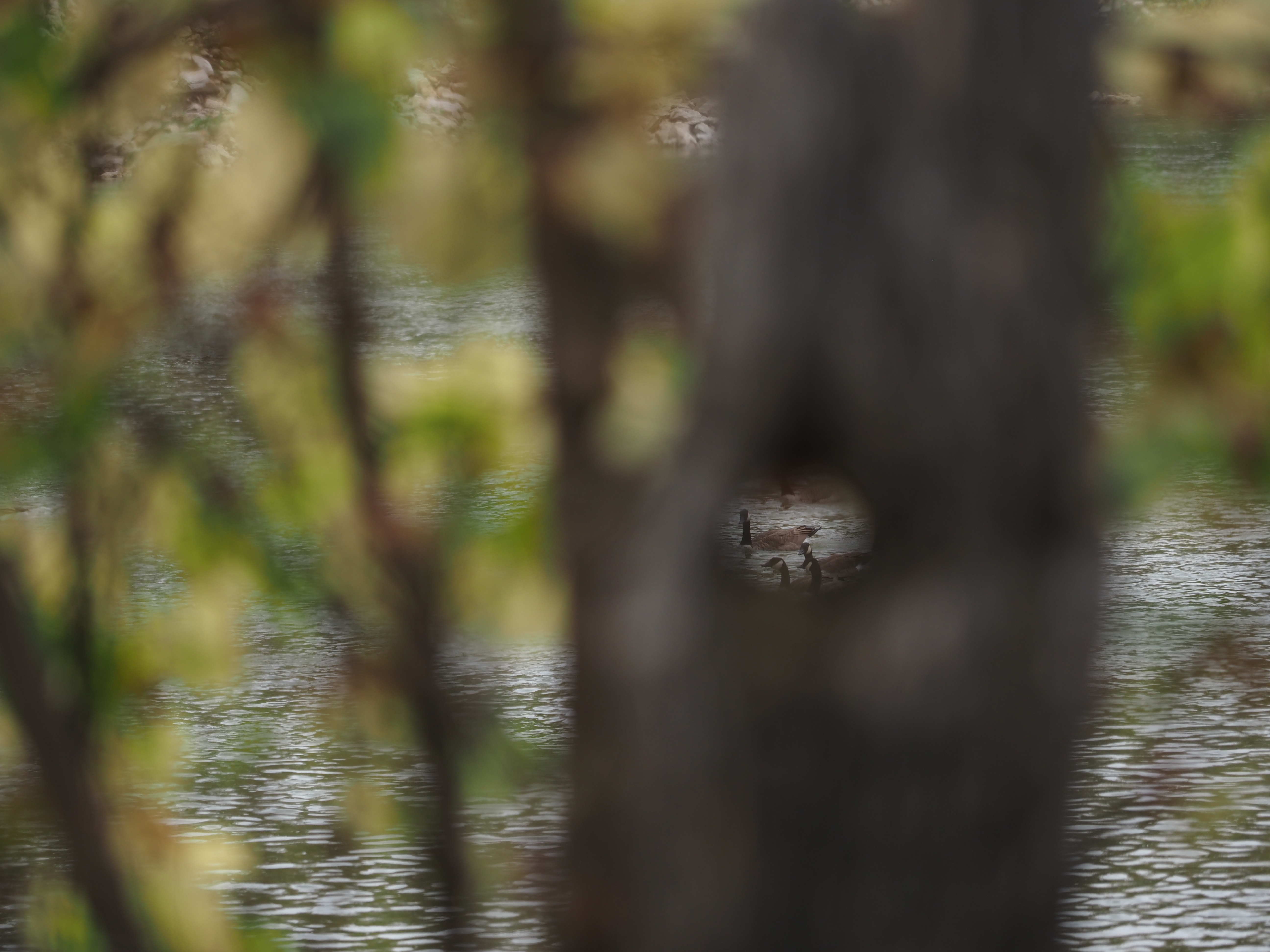 - swimming geese viewed through a hole in a tree