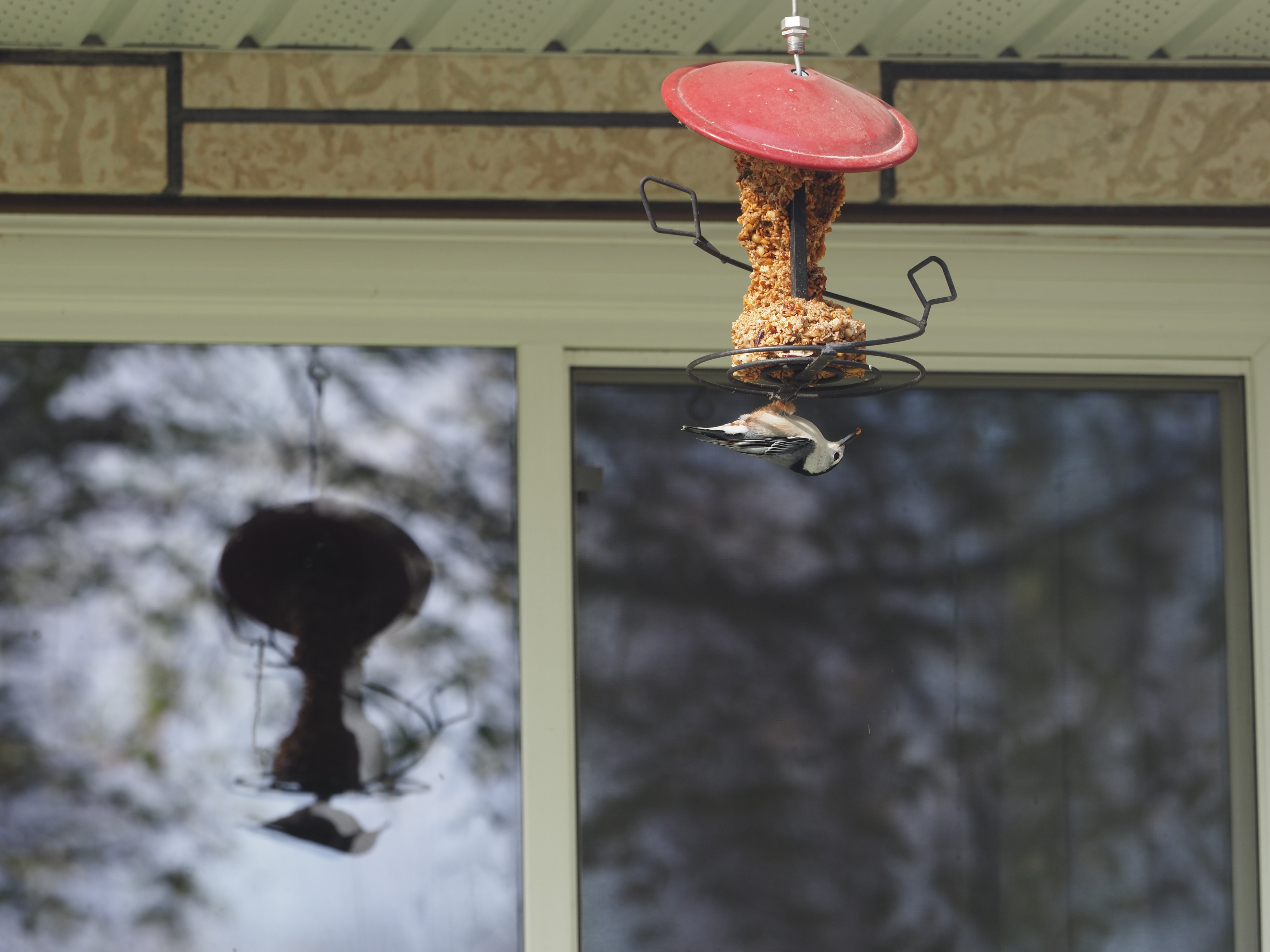 - #actions/eating #animals/bird/Nuthatch/White-Breasted #object/bird feeder #place/Canada/Manitoba/Winnipeg/River Heights #reflection