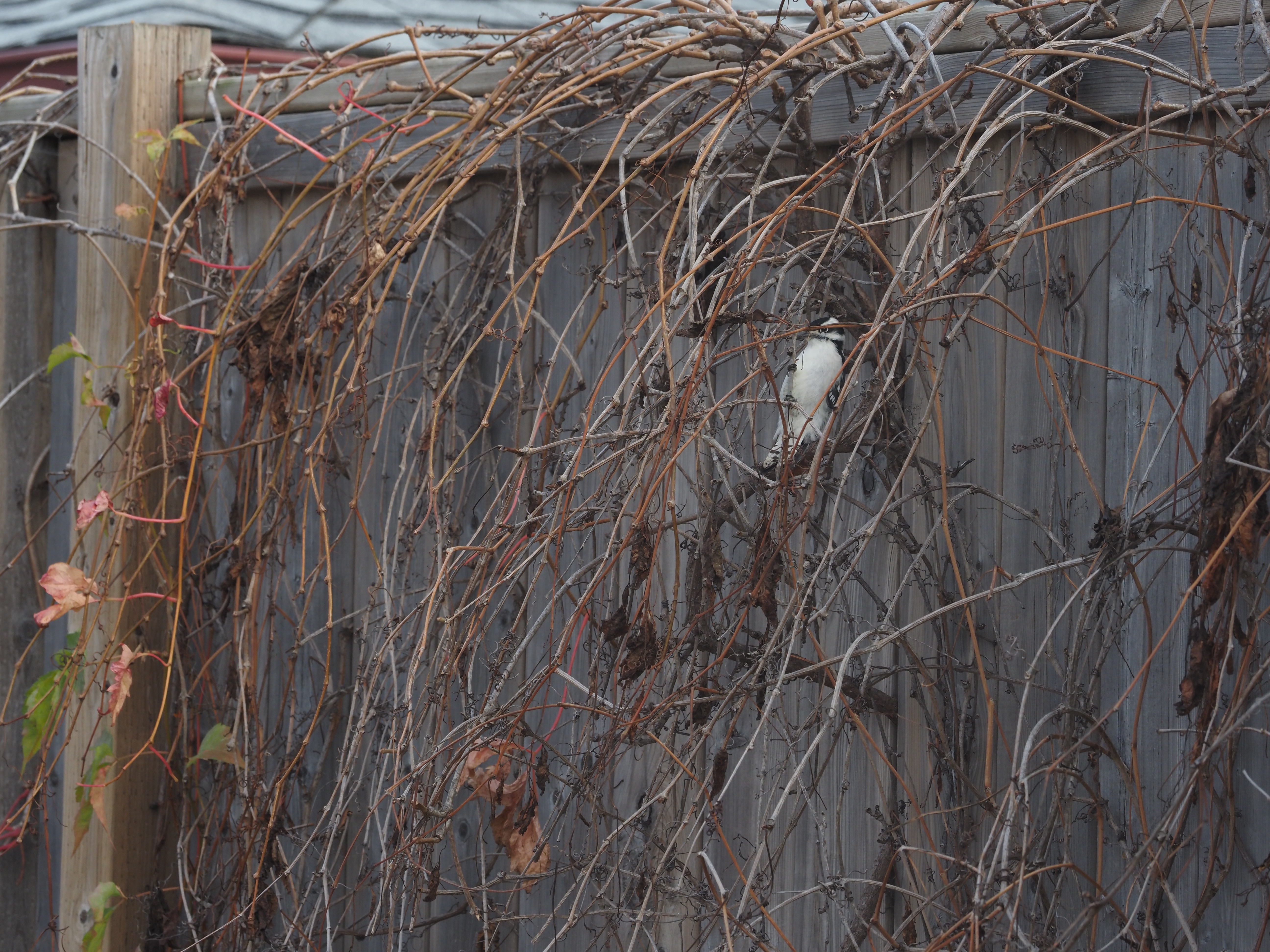 - #animals/bird/woodpecker/Hairy #architecture/fence #place/Canada/Manitoba/Winnipeg/River Heights #plants/vine