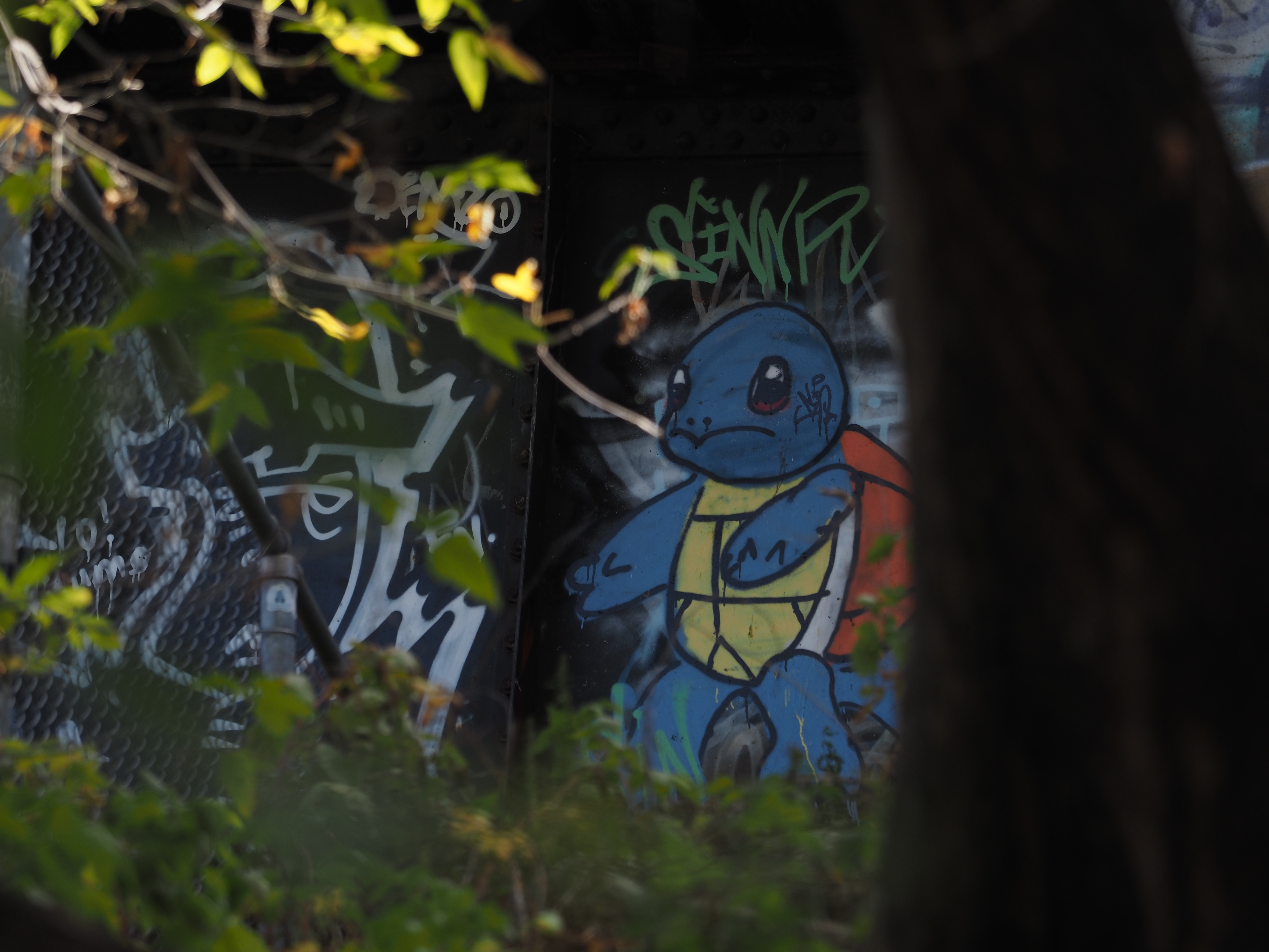 - #architecture/bridge/Winnipeg/St. Boniface #architecture/bridge/rail #drawing/graffiti #people/fictional/Pokemon/Squirtle #place/Canada/Manitoba/Winnipeg/parks/Whittier #plants/tree