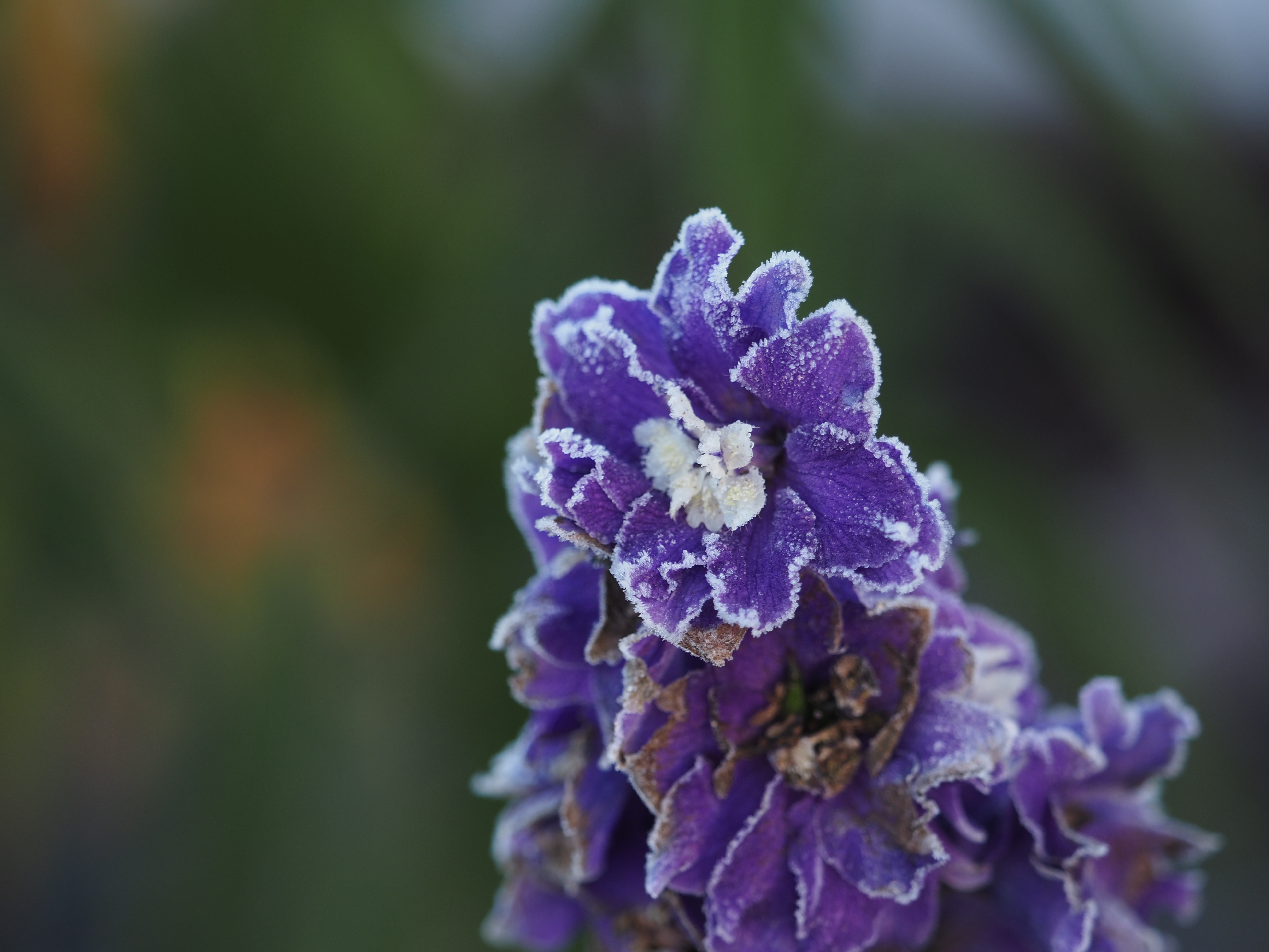 - a purple flower with frost along its edges