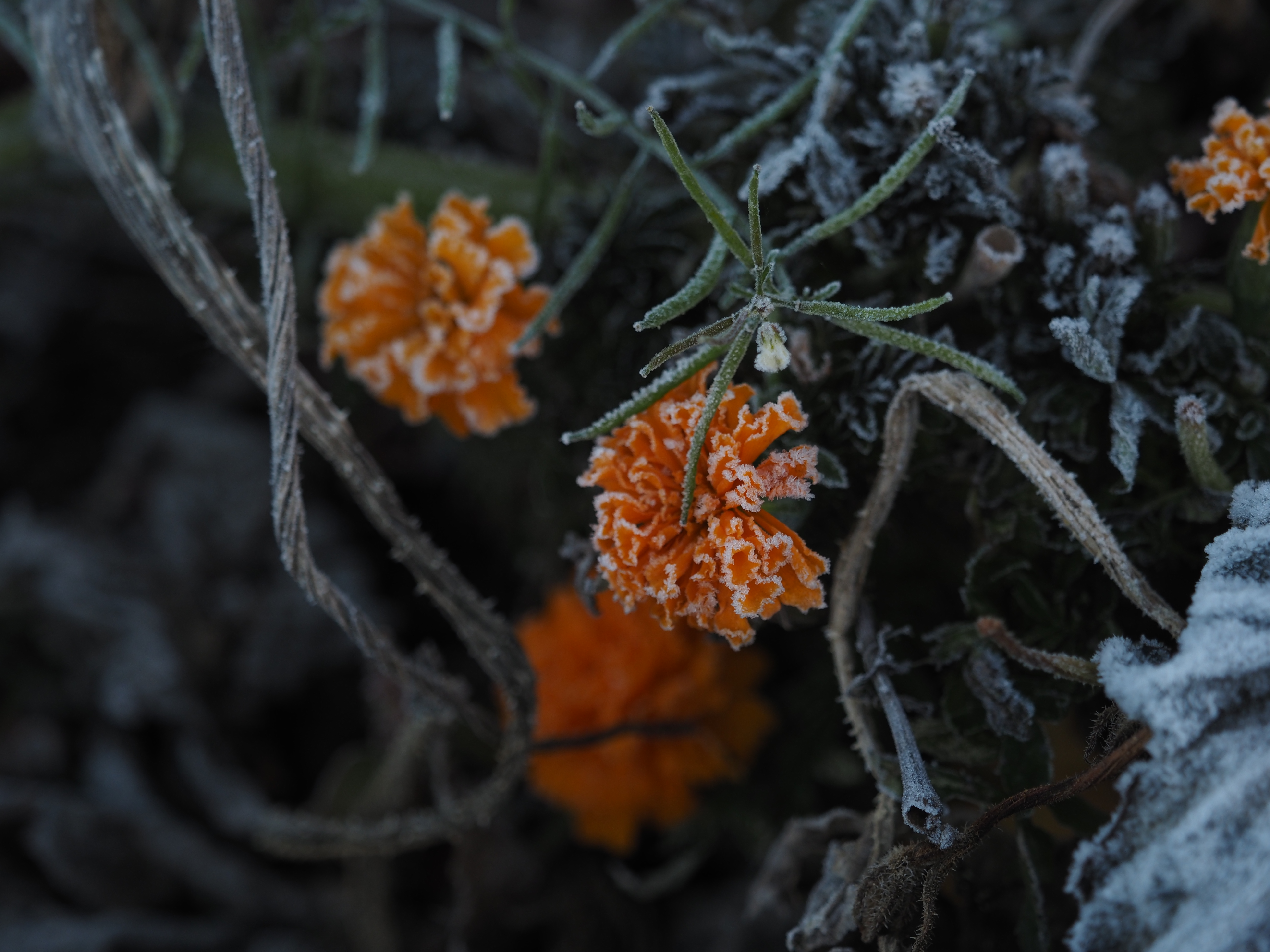 - #place/Canada/Manitoba/Winnipeg/River Heights #plants/forb/Marigold #plants/part/flower #water/frozen/frost/hoar