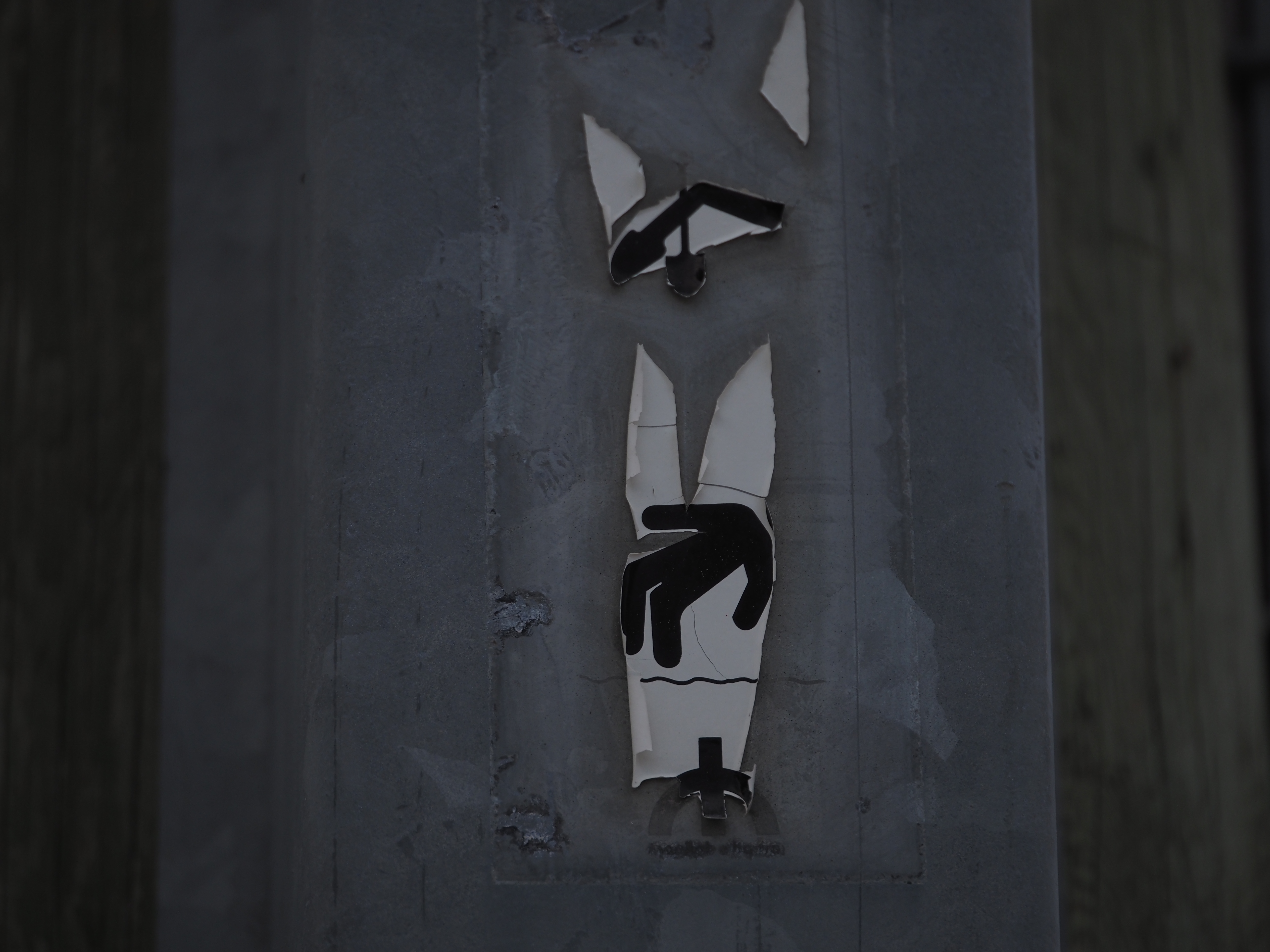 - an angular dog drawn onto the back of a street sign with the accompanying message: Goo Loud!!
