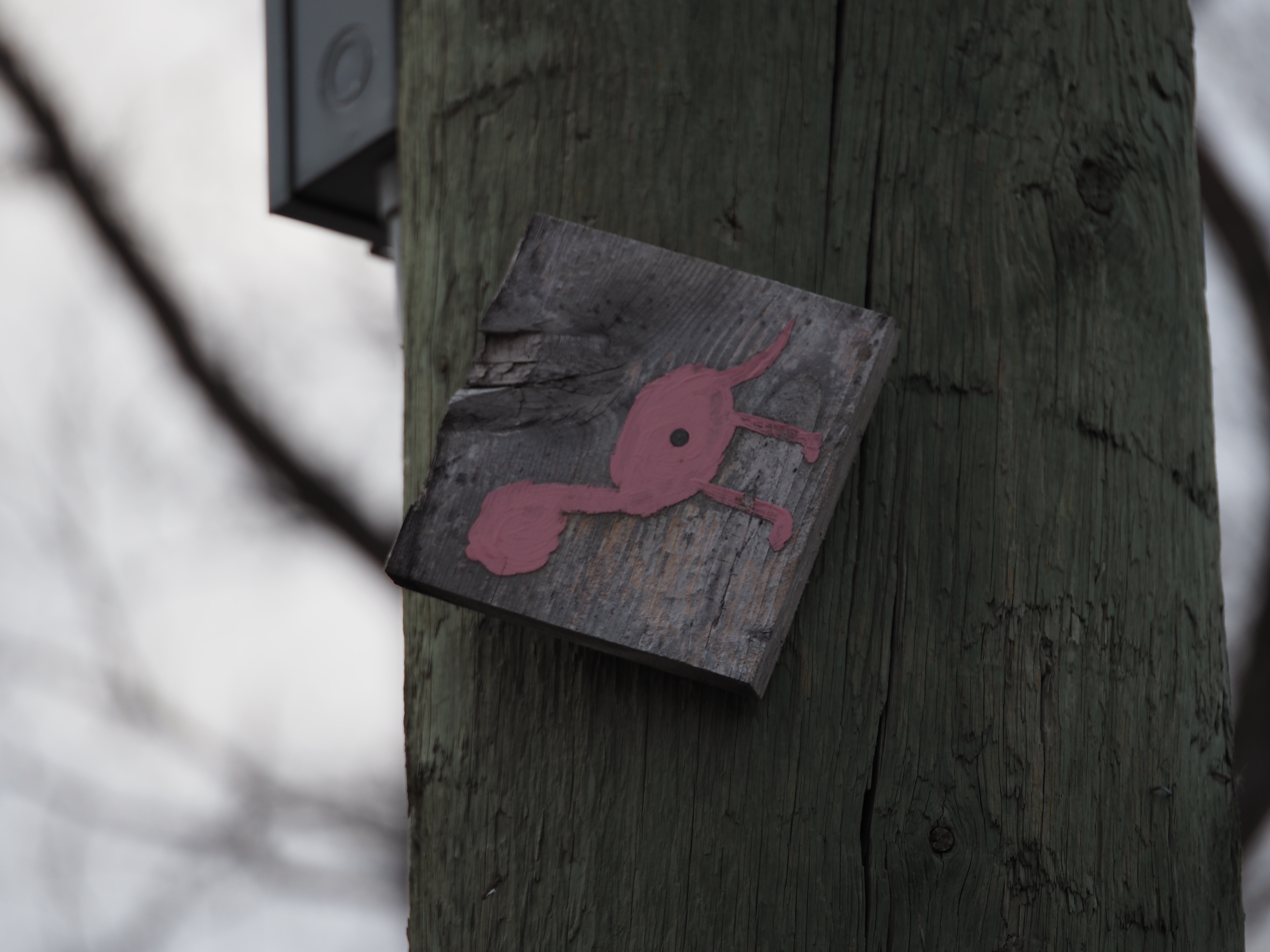 - a pink quadruped painted onto a wooden block that is nailed to a utility pole