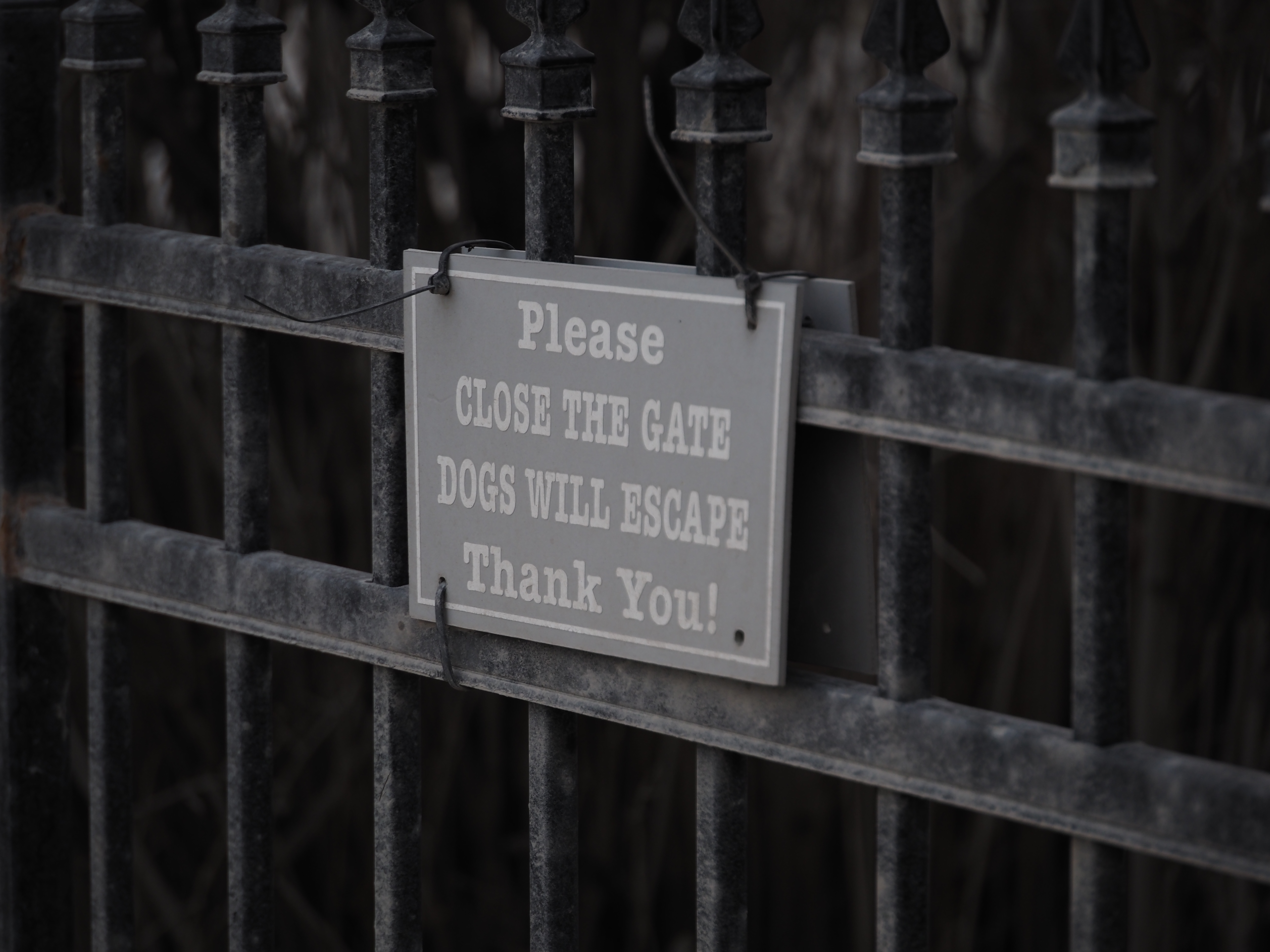 - a sign ziptied to a fence "please/close the gate/dogs will escape/thank you!" The middle two lines are in all-caps