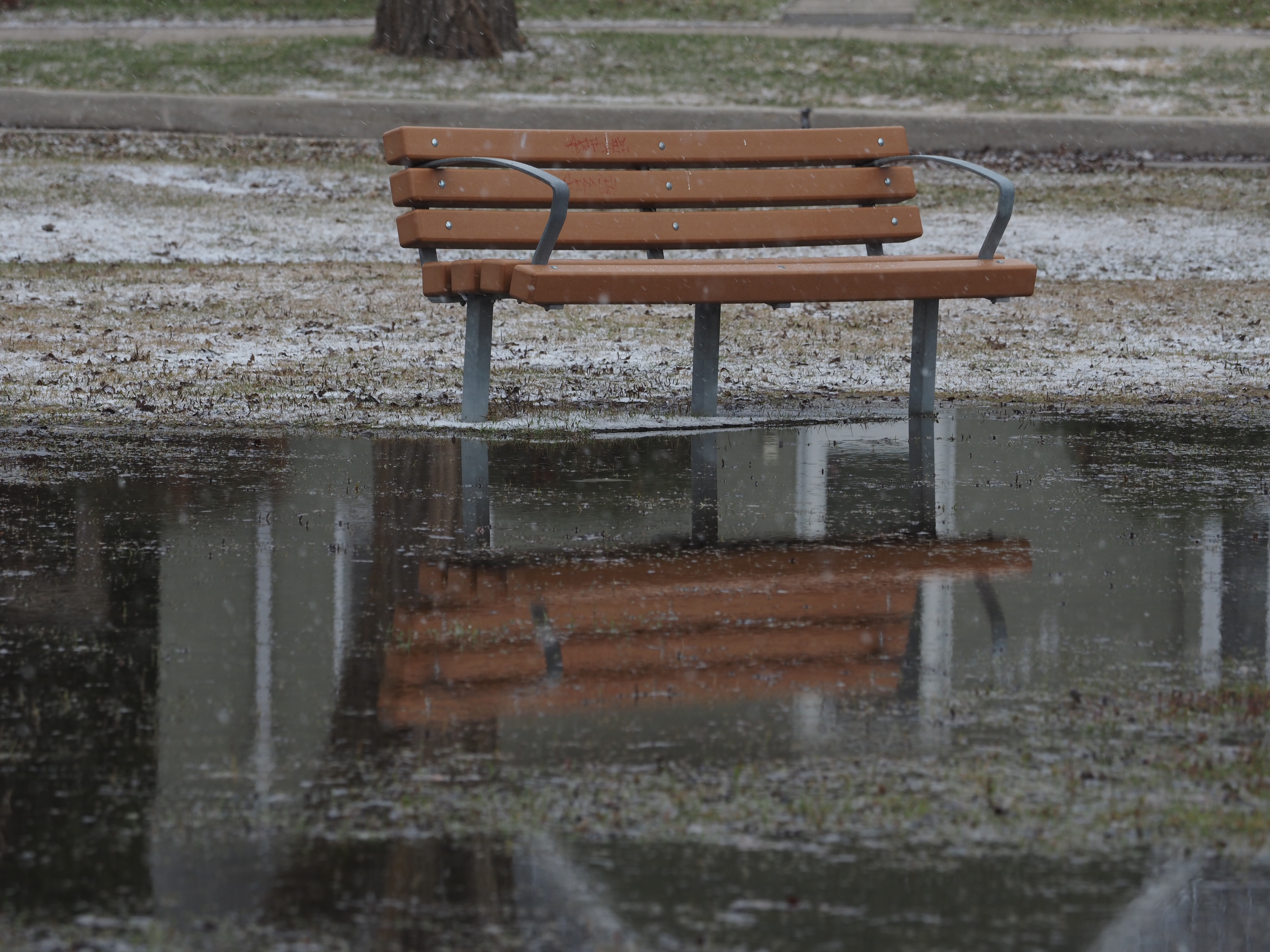 - #object/chair/park bench #place/Canada/Manitoba/Winnipeg/River Heights #place/Canada/Manitoba/Winnipeg/parks/Harrow #reflection #water/frozen/snow #water/surface/transient/puddle