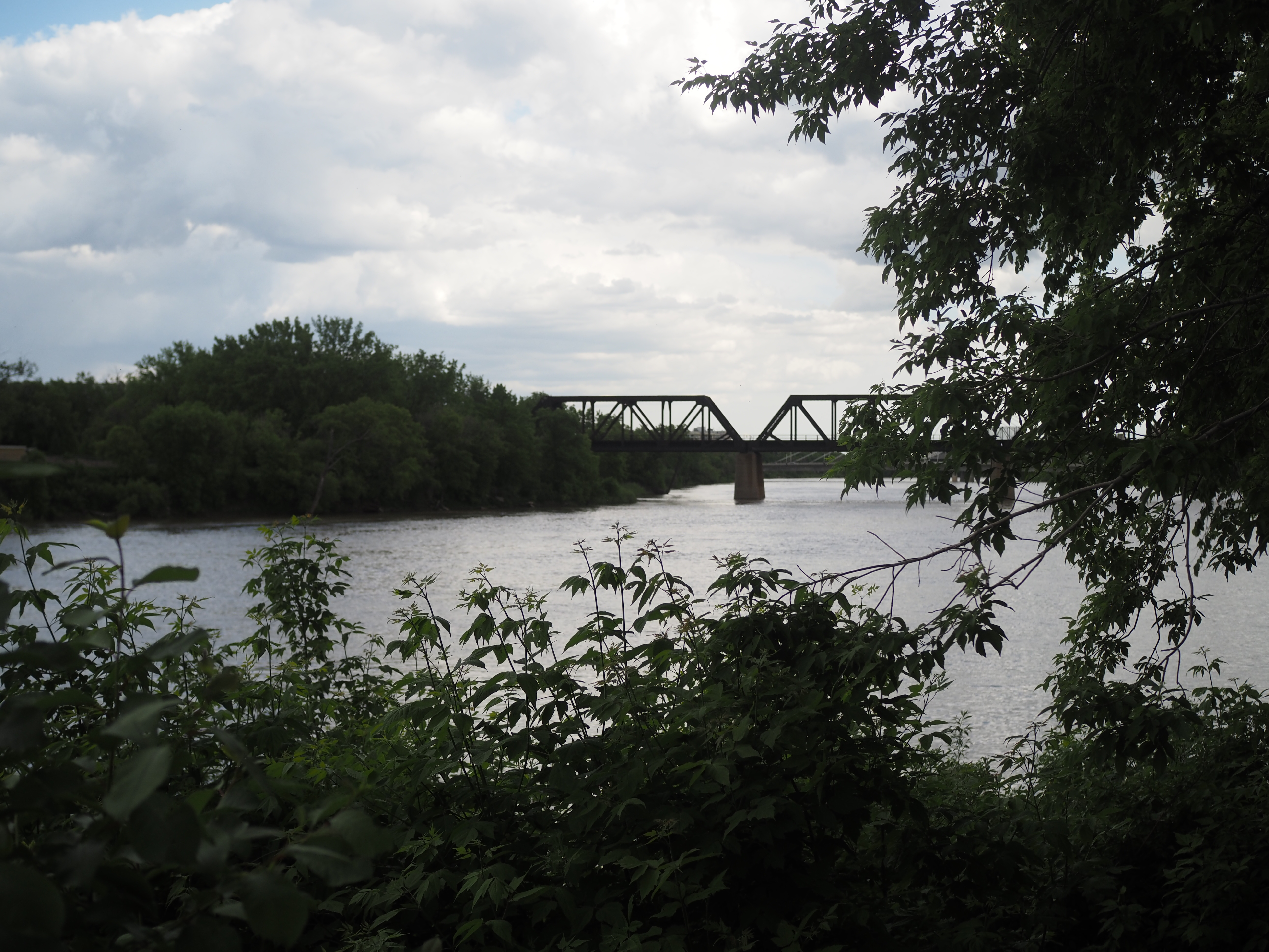 - #architecture/bridge/rail #place/Canada/Manitoba/Winnipeg/parks/Stephen Juba #plants/tree #water/surface/flowing/river/Red