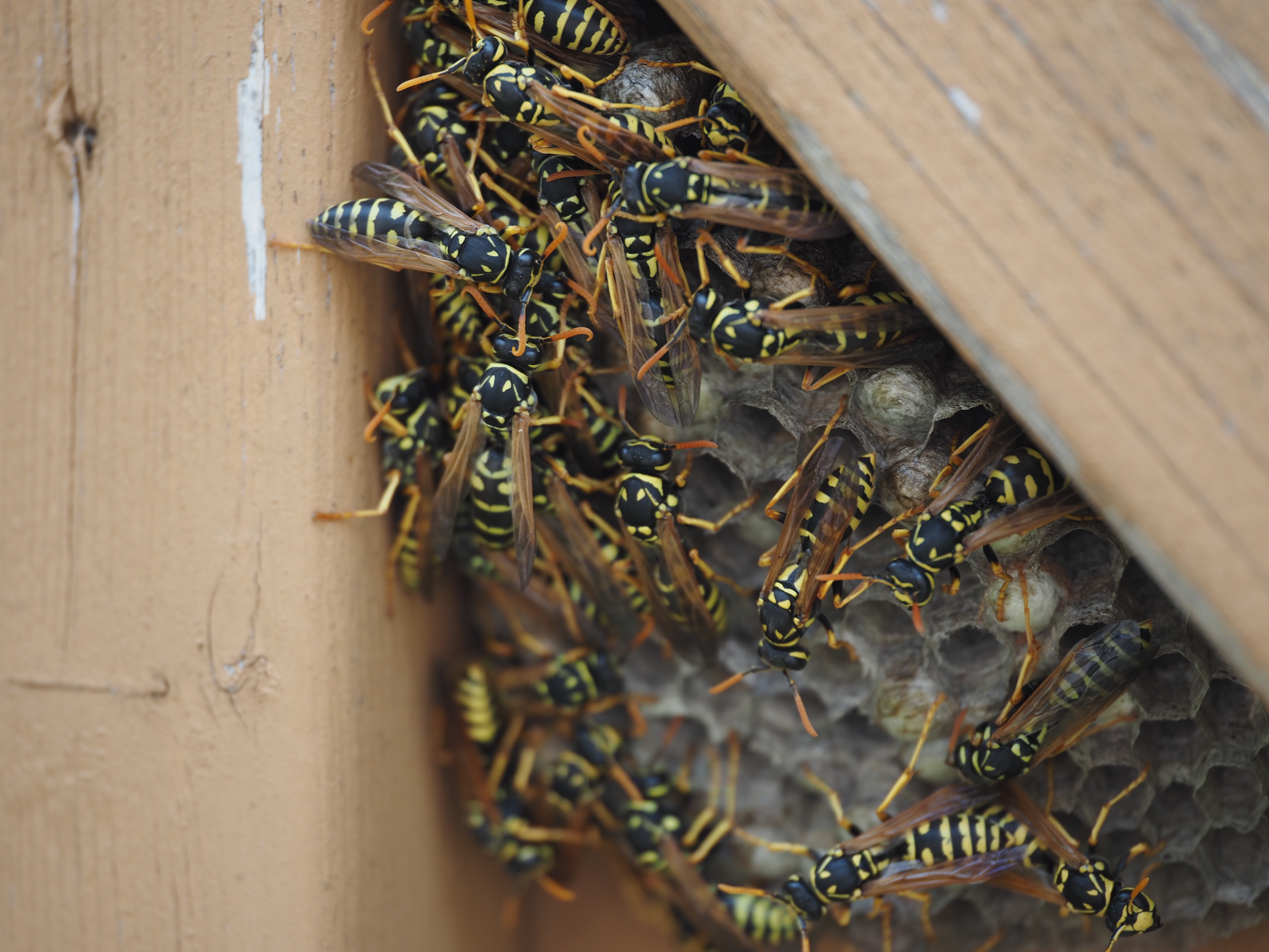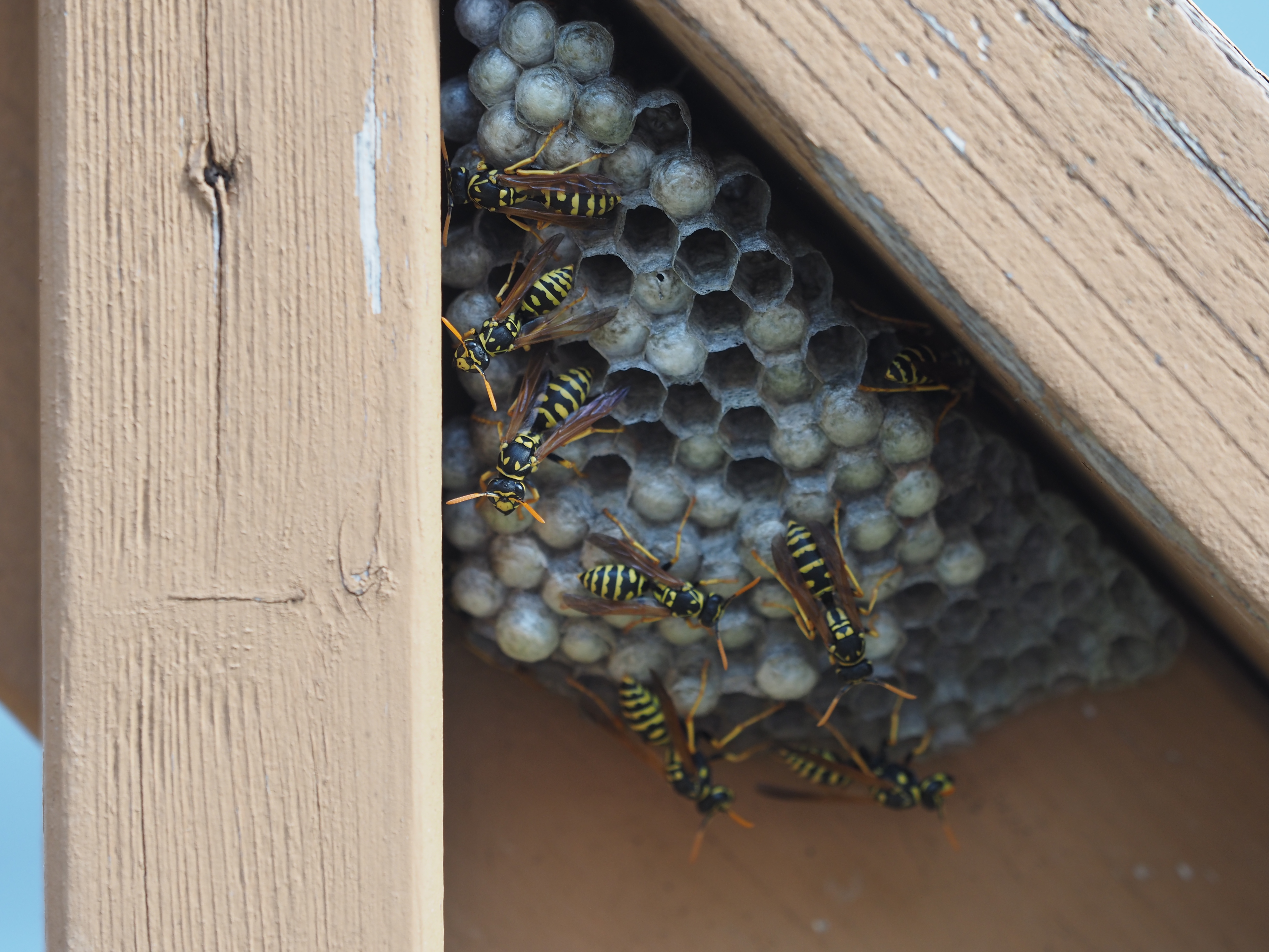 - #animals/insect/wasp/European Paper #architecture/nest/wasp #architecture/railing #place/Canada/Manitoba/Winnipeg/River Heights