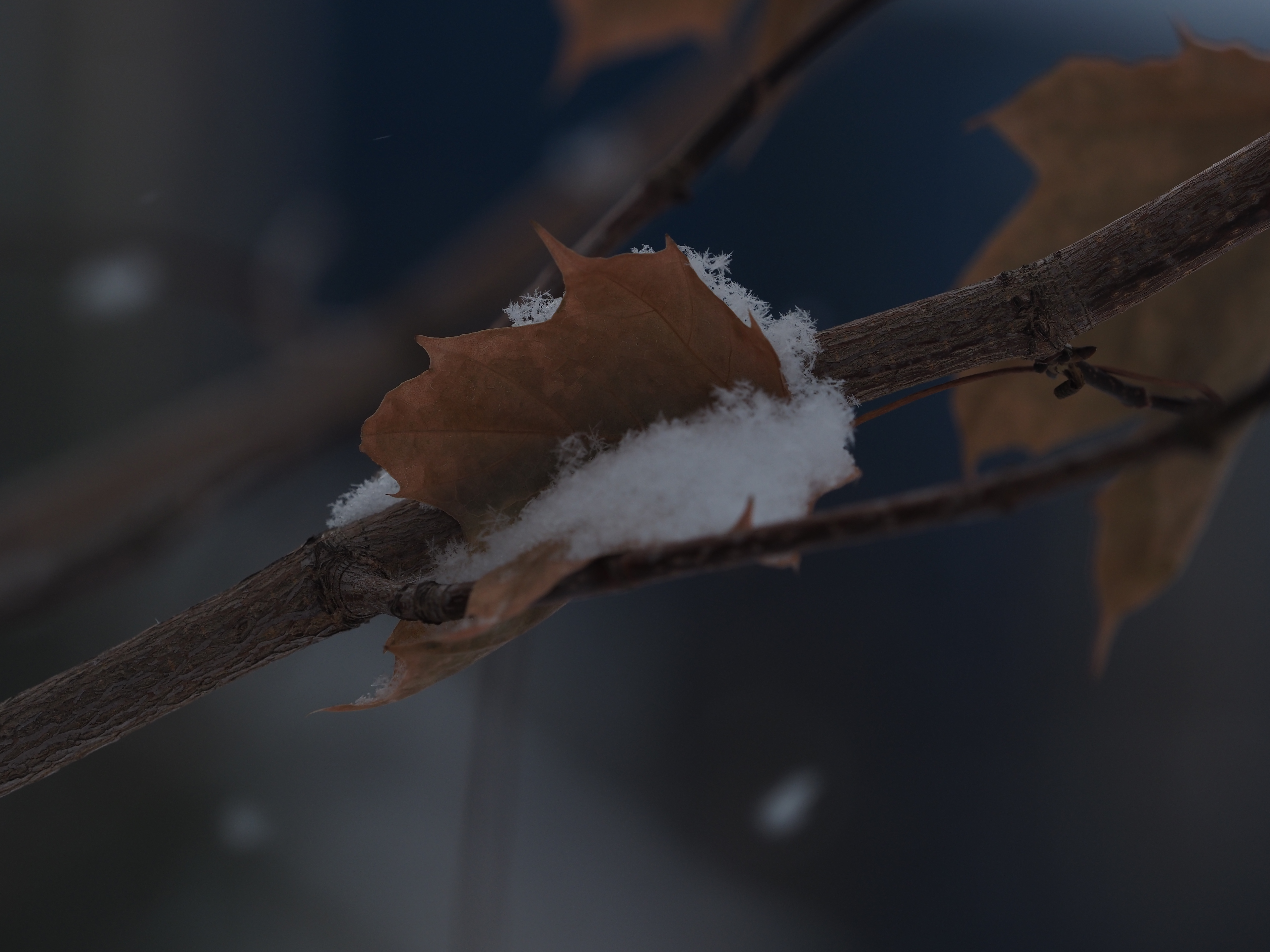 - a leaf caught against a branch and surrounded by snow