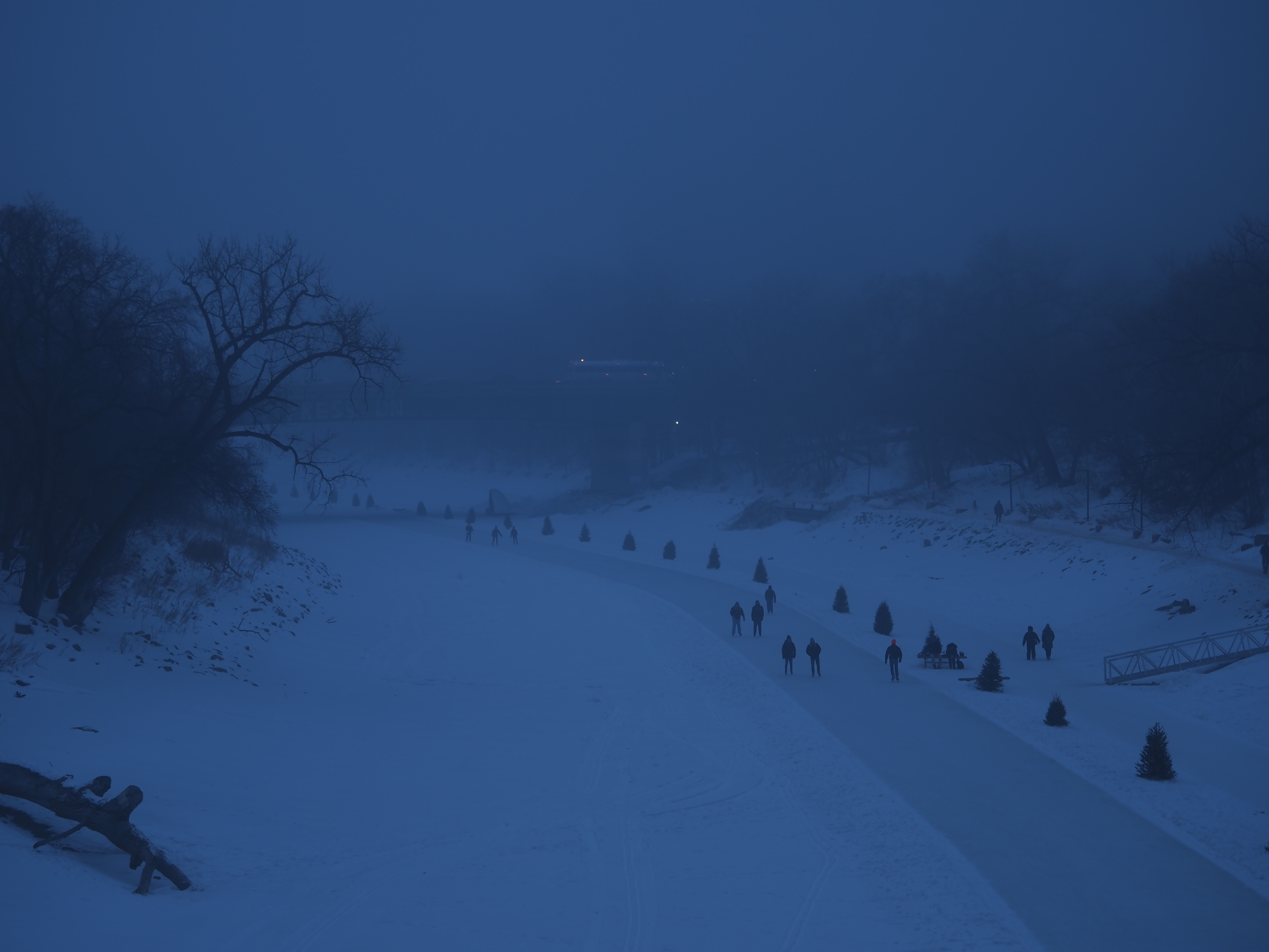 - #architecture/building/warming hut/Moon Rabbit #place/Canada/Manitoba/Winnipeg/trails/River #water/surface/flowing/river/Assinaboine