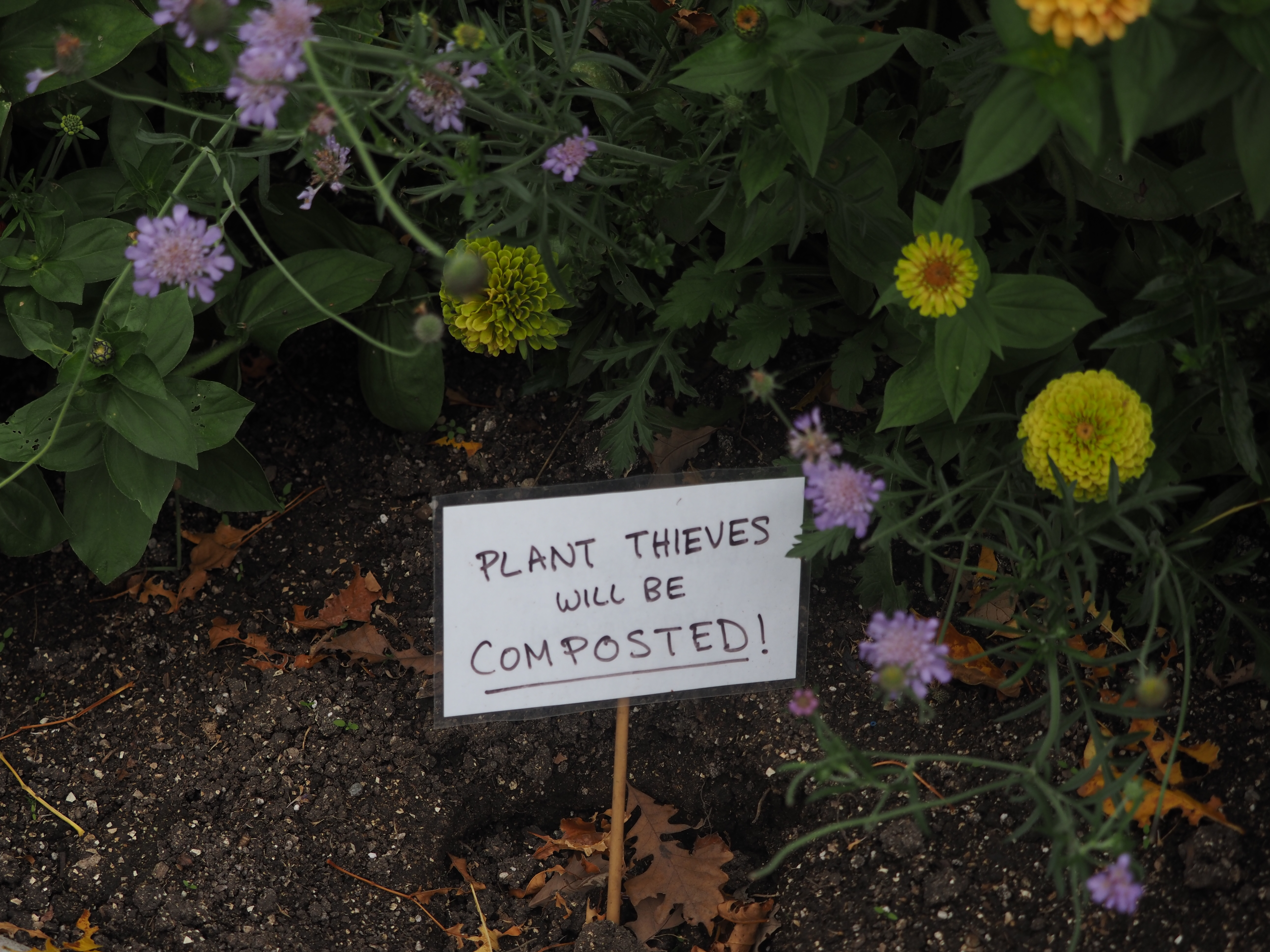 - #animals/bird/goose/Canada #place/Canada/Manitoba/Winnipeg/parks/Assinaboine #plants/forb/Pincushion Flower #plants/forb/Zinnia #plants/part/flower #text/sign
